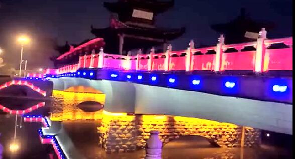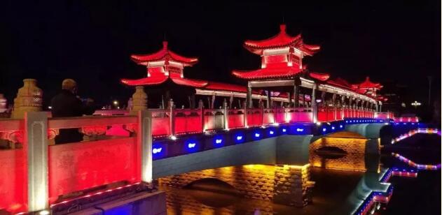 太平橋用隱藏式的瓦楞投光燈照亮建筑屋面,變幻四季顏色,絢麗多彩,形成一定的韻律感,河中倒影給人波光粼粼的勝境,整體氣勢恢弘,在橋的欄桿下一側(cè)用定制的祥云圖案燈順序排列,寓意祥和、太平,突出太平盛世文化。
